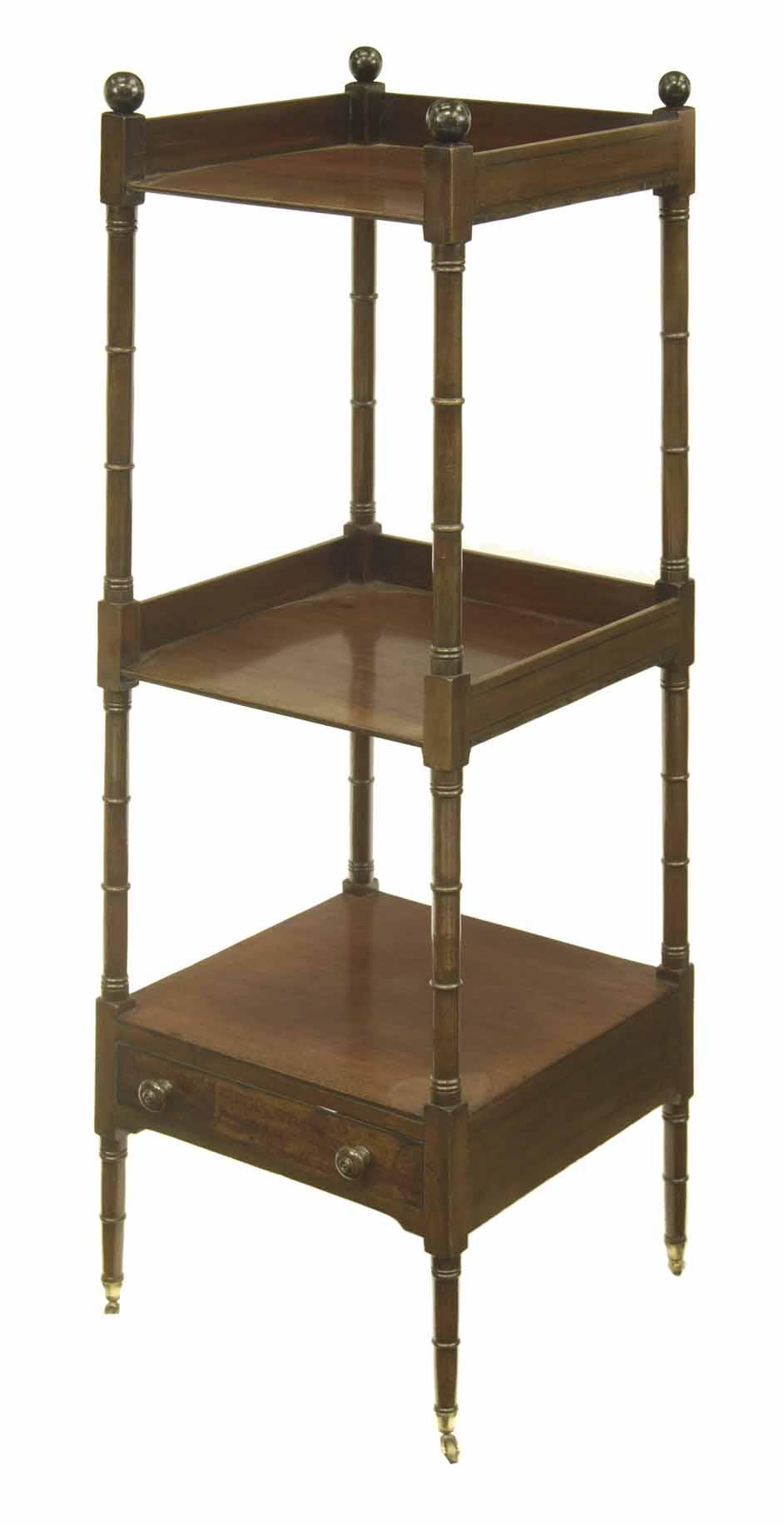 A Regency mahogany three tier whatnot, of tapering form, inlaid ebonised stringing with ring turned supports to a frieze drawer on brass castors, 48.75in (124cm) h, 17in (43.4cm) w, 17.5in (44.5cm) d.