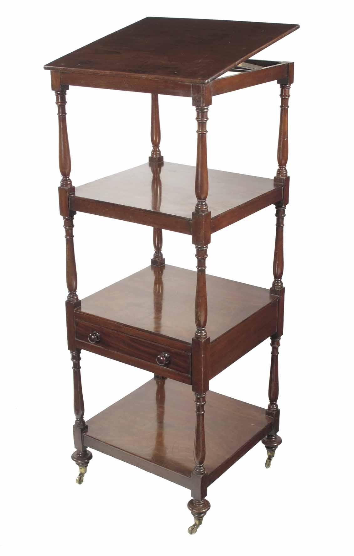 An early 19th century mahogany whatnot, with a hinged and ratchetted top with a bookrest, above three further tiers and a central drawer, on brass castors, 51.5in (131cm) h, 20.25in (51.5cm) w, 19in (48.5cm) d.