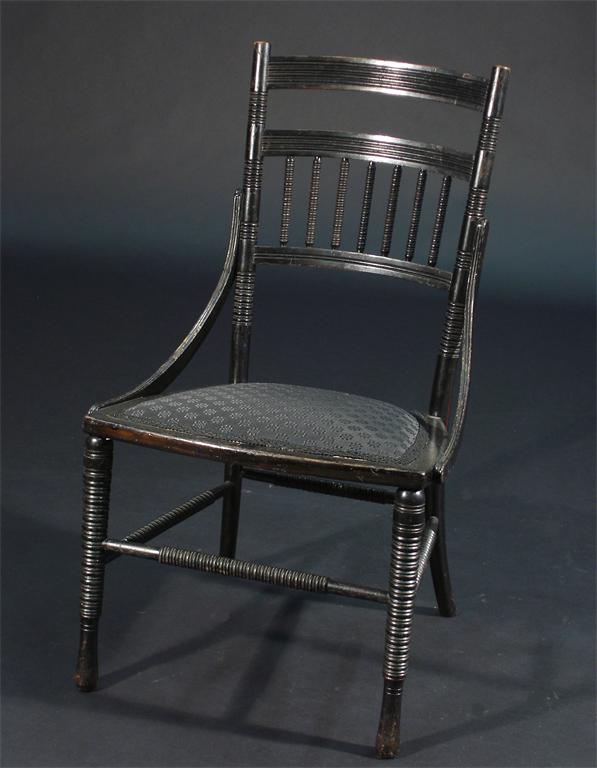 An Aesthetic Movement chair designed by R W Edis, low slung arms, with upholstered seat unmarked 77cm. high A Similar chair was exhibited at the Manchester Health Exhibition 1884