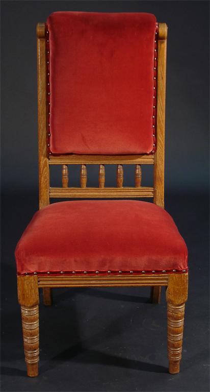 A pair of James Capel oak chairs designed by Alfred Waterhouse for Blackmoor, with padded seat and back panels unmarked 98cm. high