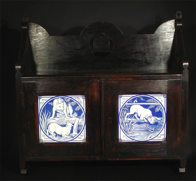 A small Aesthetic Movement wall cabinet the doors set with Minton's tiles designed by John Moyr...