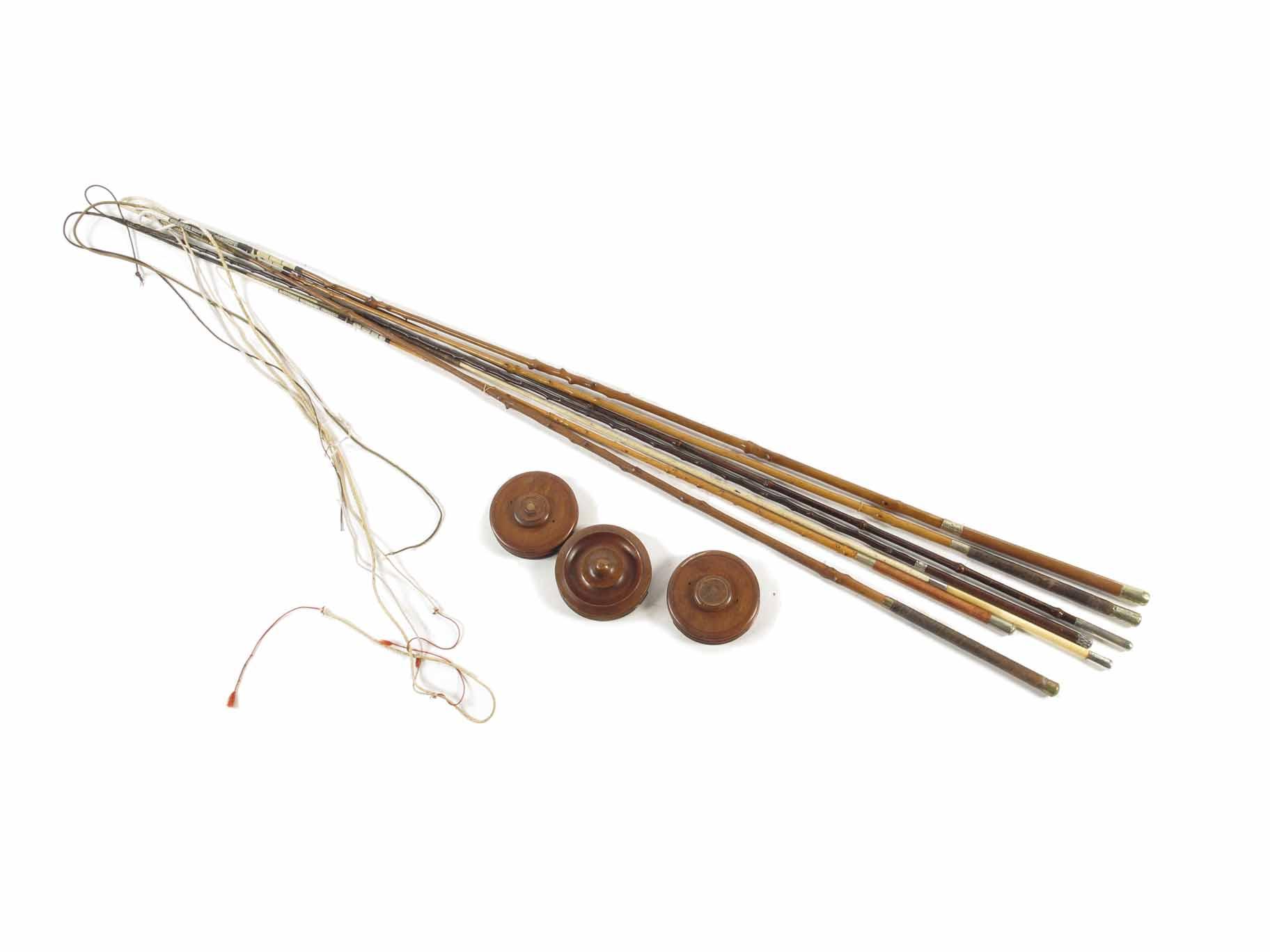 Seven coaching whips, in various woods with plated silver, brass and nickel mounts, one stamped 'Waine', one 'London' hallmarked 1878, another 1897, approx 68in (173cm) l, together with three turned mahogany whip reels. (10)