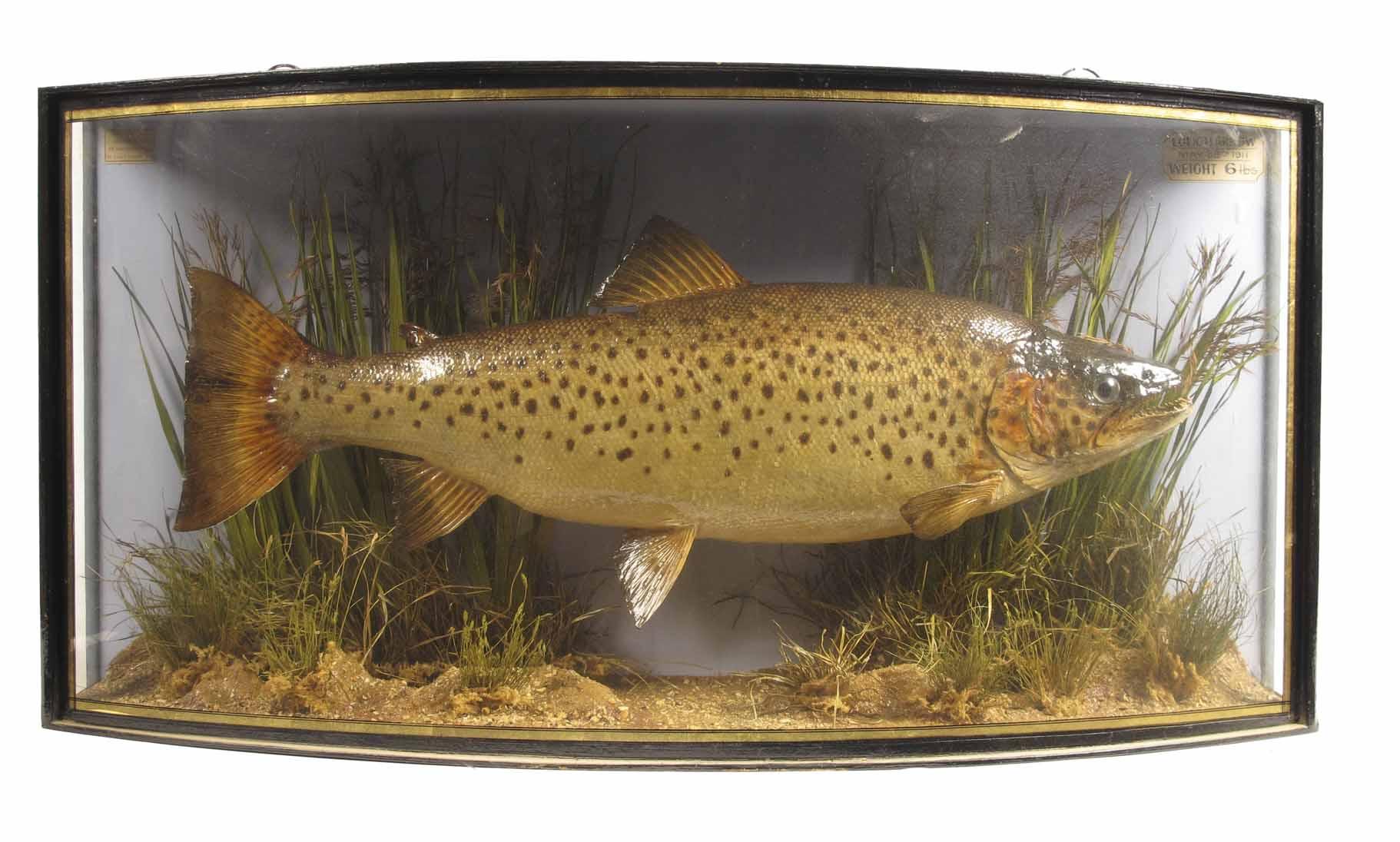 A bowfront cased Trout, preserved by J Cooper & Sons, 28 Radnor St, St Luke's, London E.C., with hand written label 'Lough Arrow, May 29th 1911, Weight 6lbs', 14.5in (37cm) h, 29in (74cm) w.