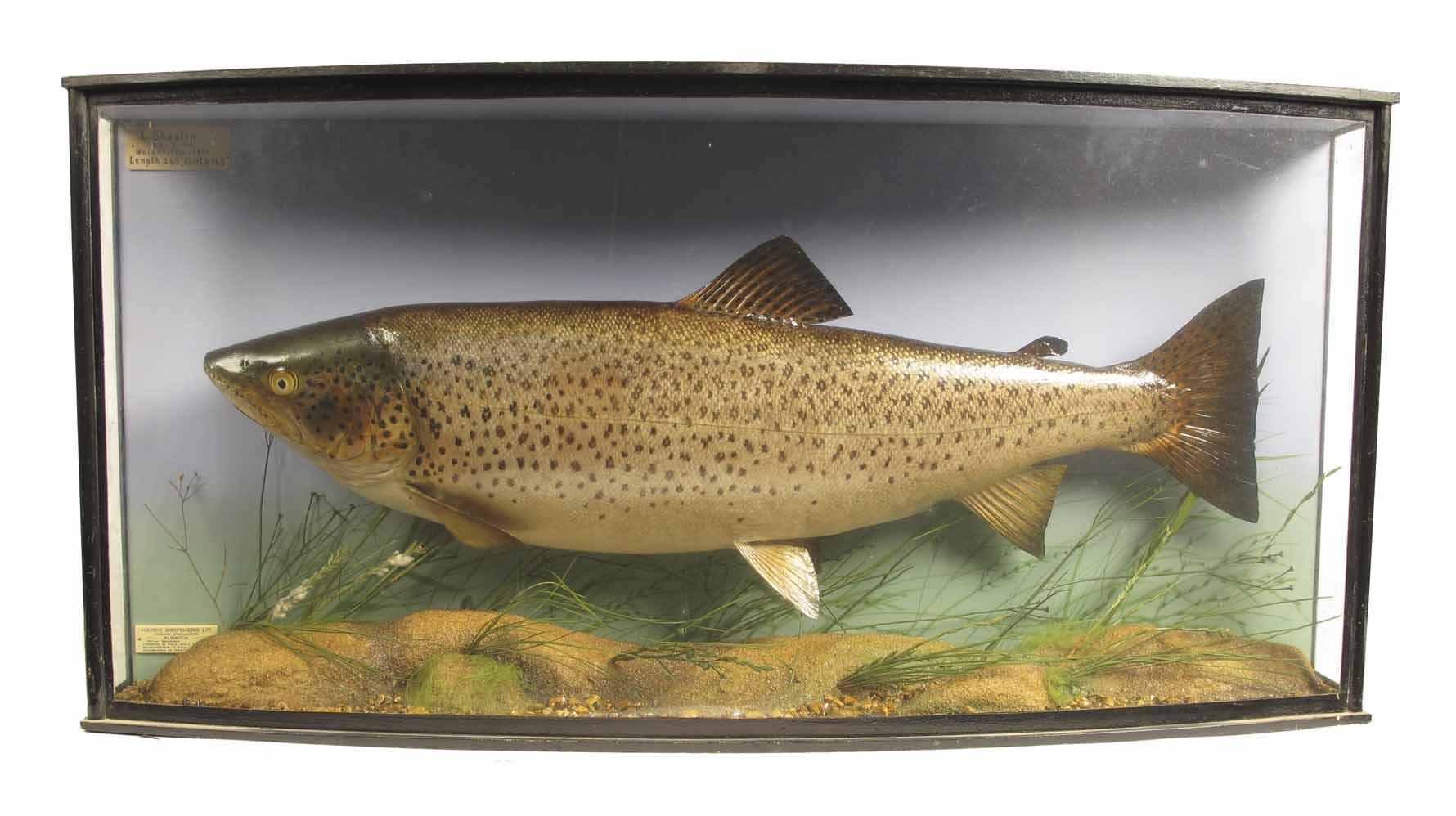 A bowfront cased Trout, with ivorine label for 'Hardy Brothers Limited', hand written paper label 'L. Sheelin, 29-5-28, weight, 7lbs 13ozs, Length 24 1/2", Girth 14 3/4", 14.75in (37.5cm) h, 29.75in (75.5cm) w.