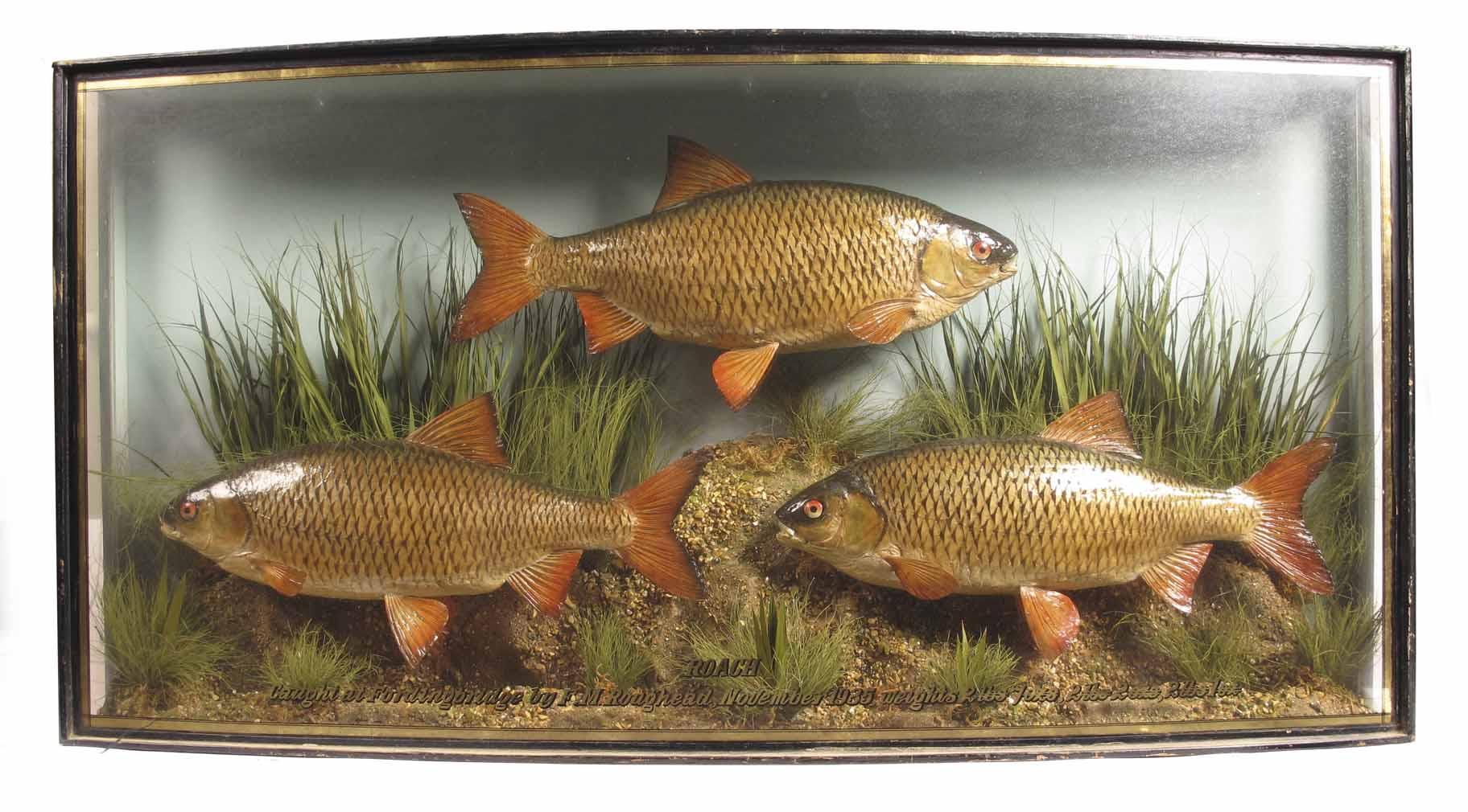 A bowfront cased group of three Roach, preserved by J Cooper & Sons Taxidermists, 28 Radnor St, St Luke's, London, E.C., glass with gilt lettering 'ROACH. Caught at Fordingbridge by F.M. Roughead, November 1935. Weight 2lbs 7ozs, 2lbs 2ozs, 2lbs 1oz.' 18.5in (47cm) h, 36.5in (93cm).