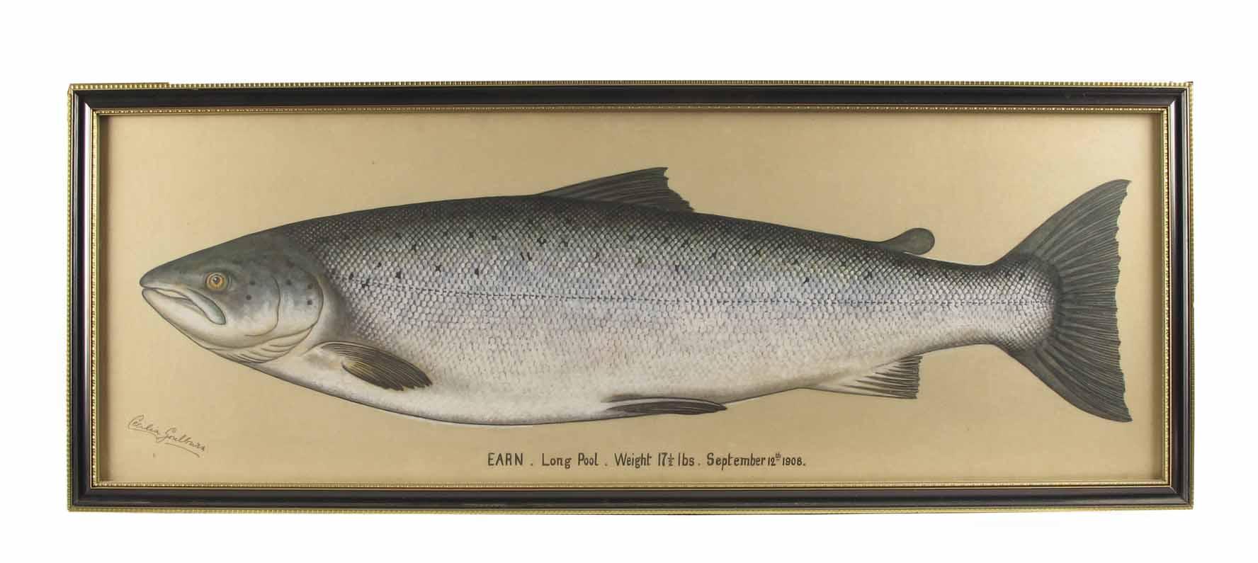 Cecilia Goulburn, British 19th/20th century. A trophy salmon, titled 'EARN'. Long Pool. Weight 17½lbs. September 12th 1908., watercolour, signed, 13 x 37.5in (33 x 95cm).