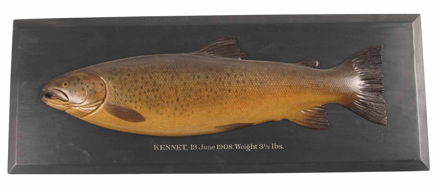 A carved and painted wood Trout half block by G Farlow & Co Ltd, mounted and titled 'KENNET, 13 June 1908. Weight 3½ lbs,' faint stencil to reverse, 9.5in (24cm) h, 25in (63.5cm) w.