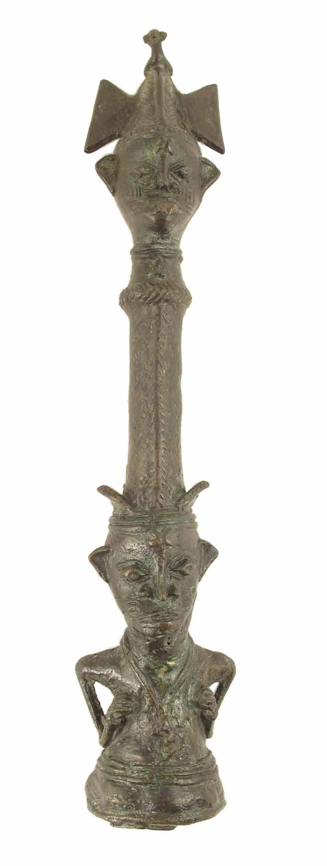 A Yoruba bronze staff, the base with a female bust to a column shaft with male head his pointed hat with a thunder axe and bird finial, late 19th/early 20th century, 14in (35.5cm) h.