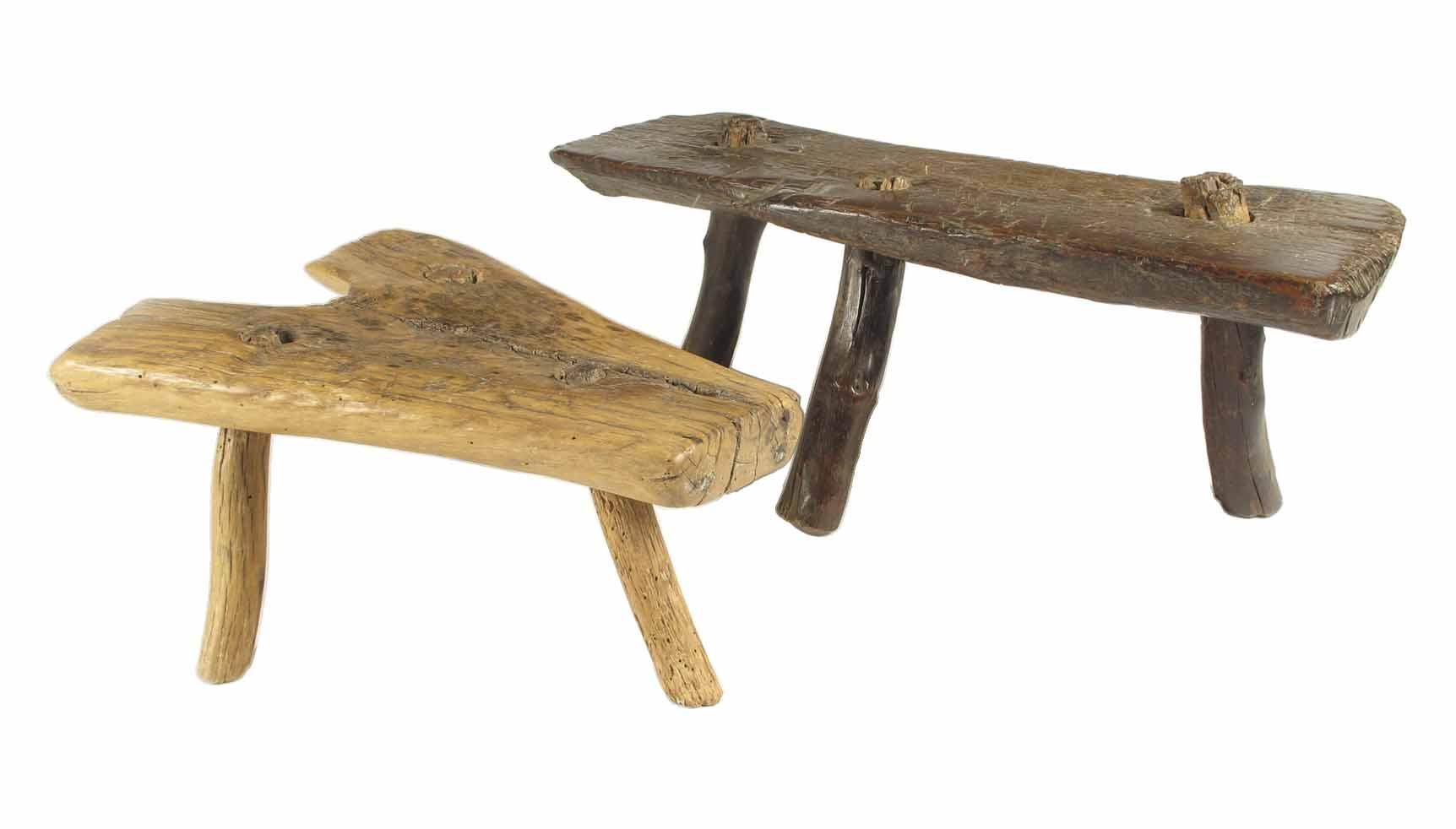 Two 19th century South African primitive stools, both with three legs, one made from stinkwood, 8in (20.5cm) h, 24in (61cm) w., the other yellow-wood. (2)