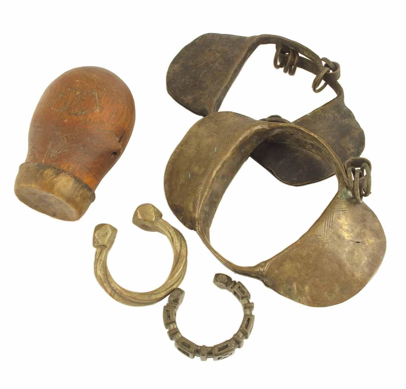 Two Yoruba brass anklets, with punched line and circle decoration, filled with beads and with ring attachments, 8in (20cm) w, two cast metal currency bangles, and a hardwood flask with gut cover, one side with incised line decoration. (5)
