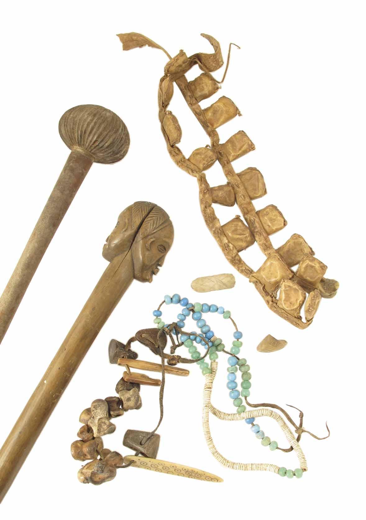 A Witch Doctors divining instrument, a rattle belt, glass beads; together with a good South African knobkerrie with fluted flattened ball head, 28.5in (72cm) l; and an African double headed short staff/prestige stick, 23in (58.5cm) l. (5)