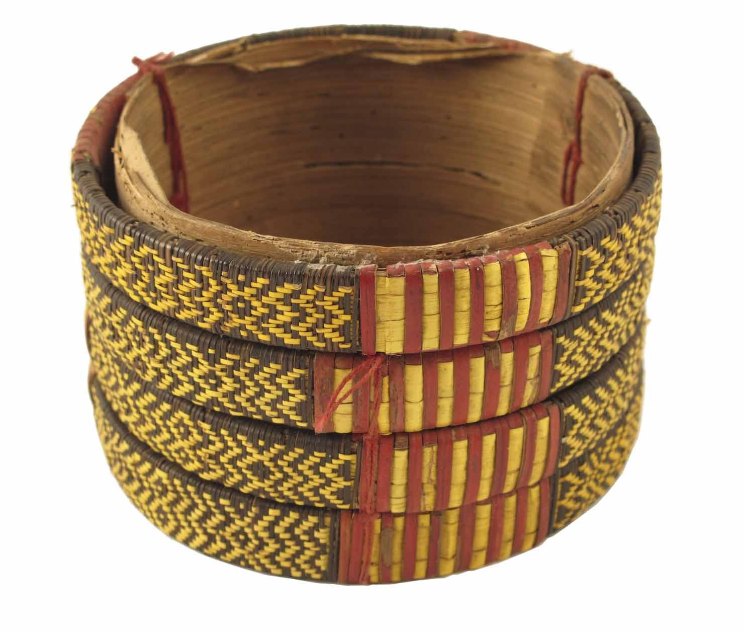 A bundle of four armbands, fine woven and polychrome grass, with old inscription 'Naga', 19th century, 3.9in (10cm) dia.