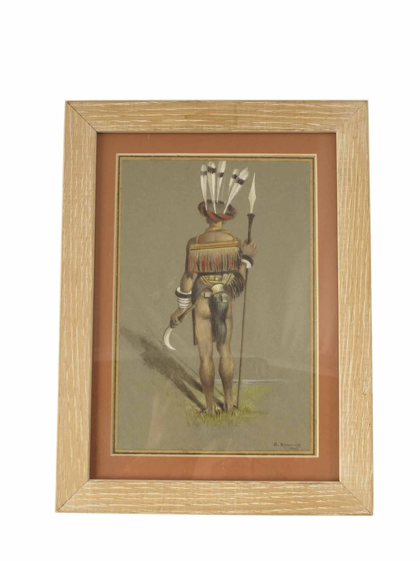B Bhoumik. A watercolour, depicting a 'Naga' Chief, inscription to reverse ' Naga Head Hunter by B.L. Bhoumik, Silehan 1945 (Assam)', 11 x 8.25in (27.9 x 21cm) framed.