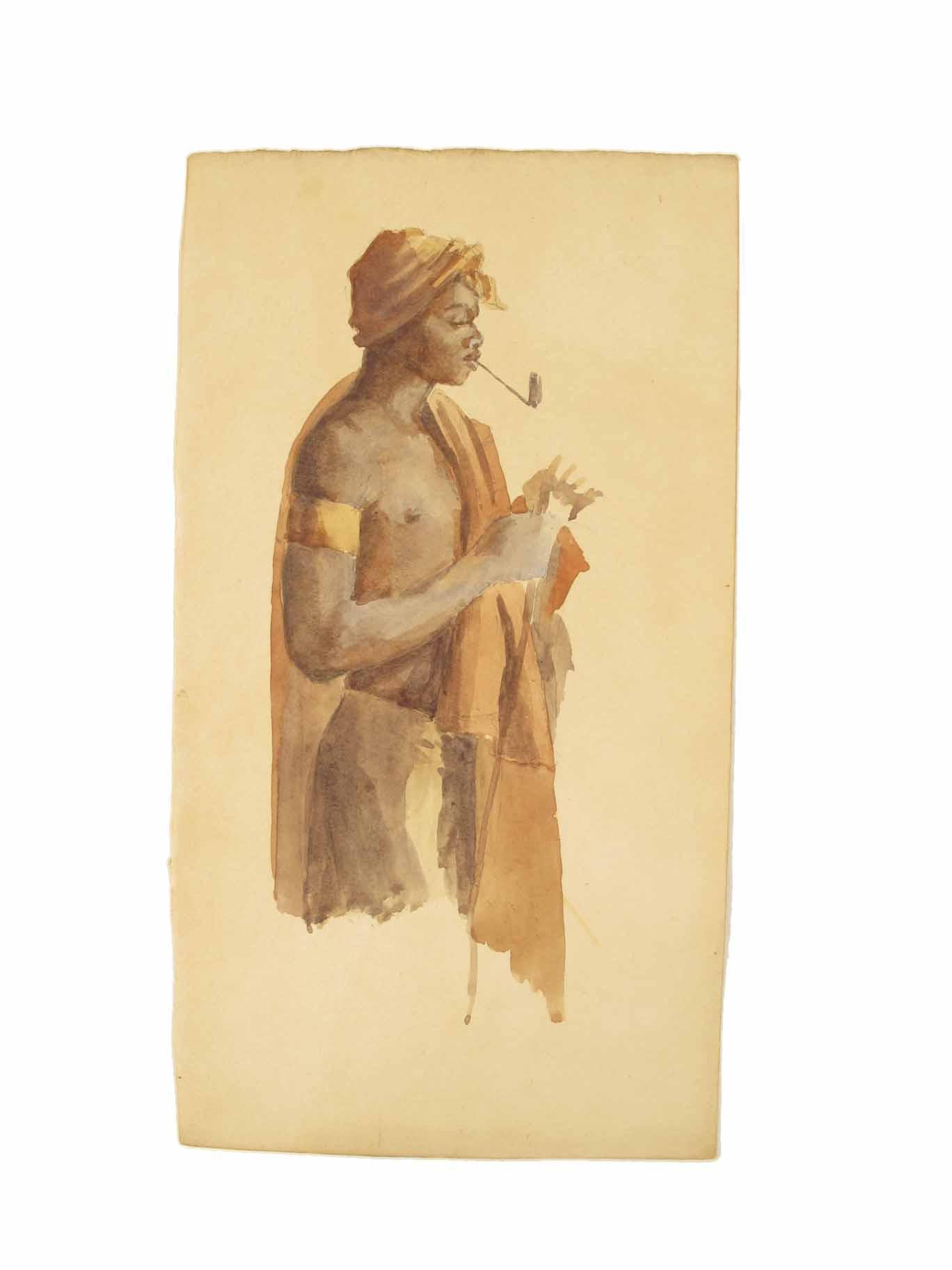 A watercolour on paper, of a South African Xhosa man smoking his pipe, late 19th century, 10.5 x 6in (26.5 x 15cm).