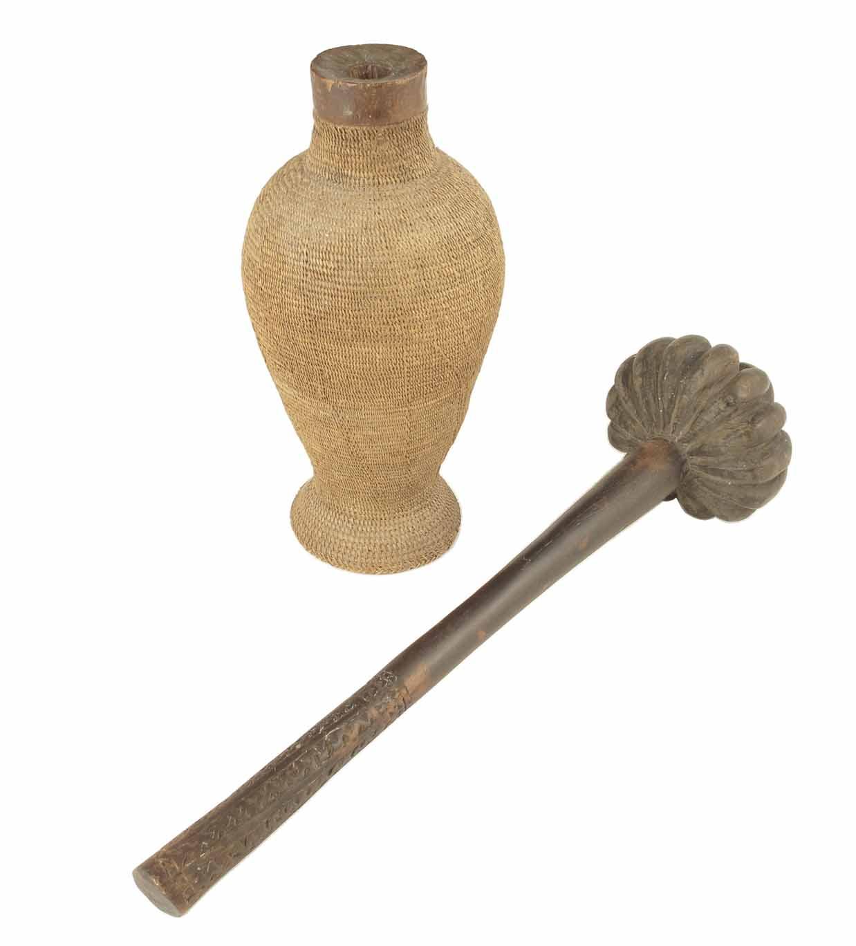 A Polynesian hardwood knobkerrie, the handle with zigzag incised lines, 17in (43cm) l, a woven vase shape bottle with a wooden neck, 10in (25.5cm) h. (2)