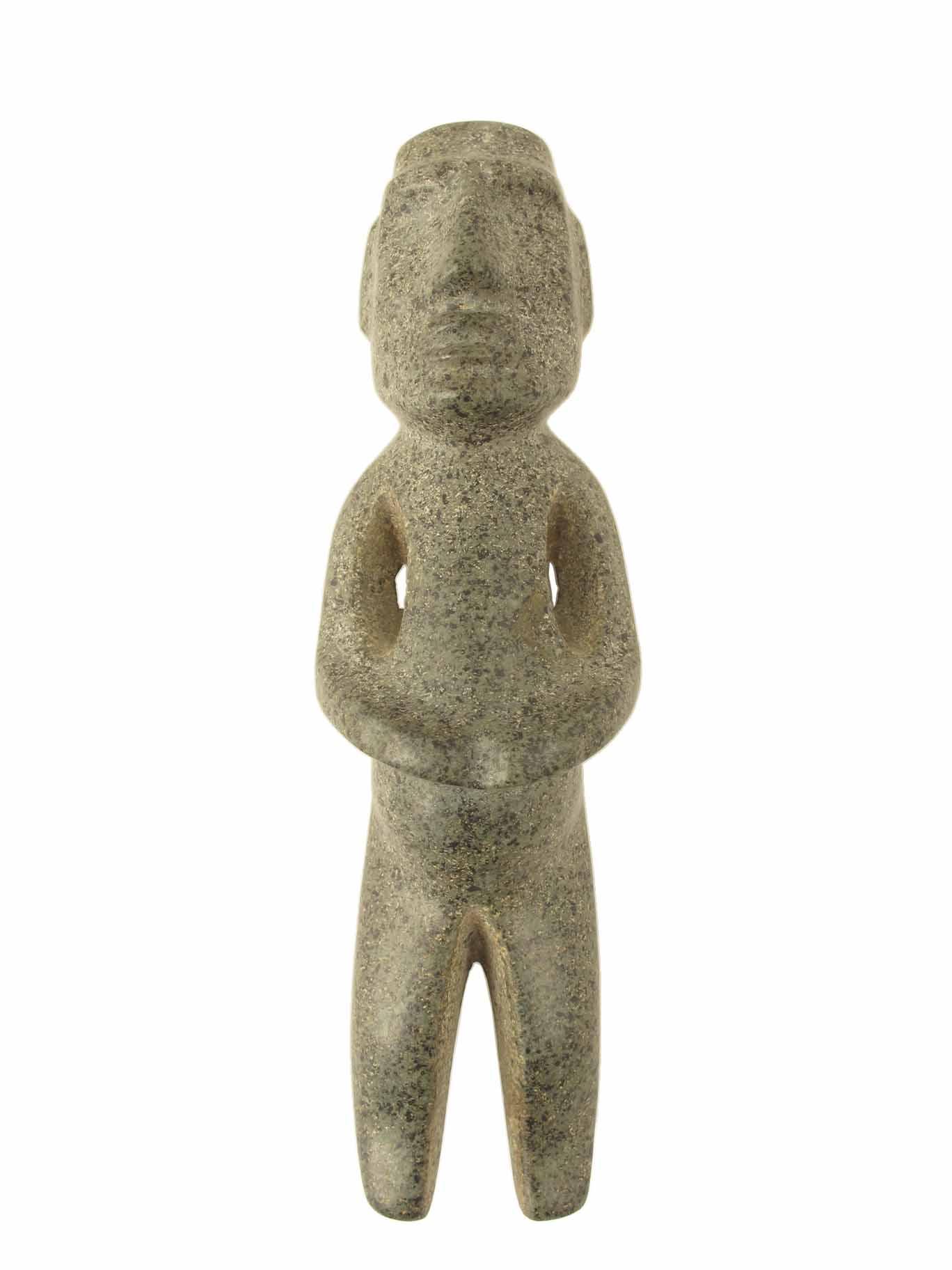 A Central American green stone carved 'Mezcala' standing figure, of an abstract figure, pierced between the arms resting on its abdomen, 8in (20cm) h.