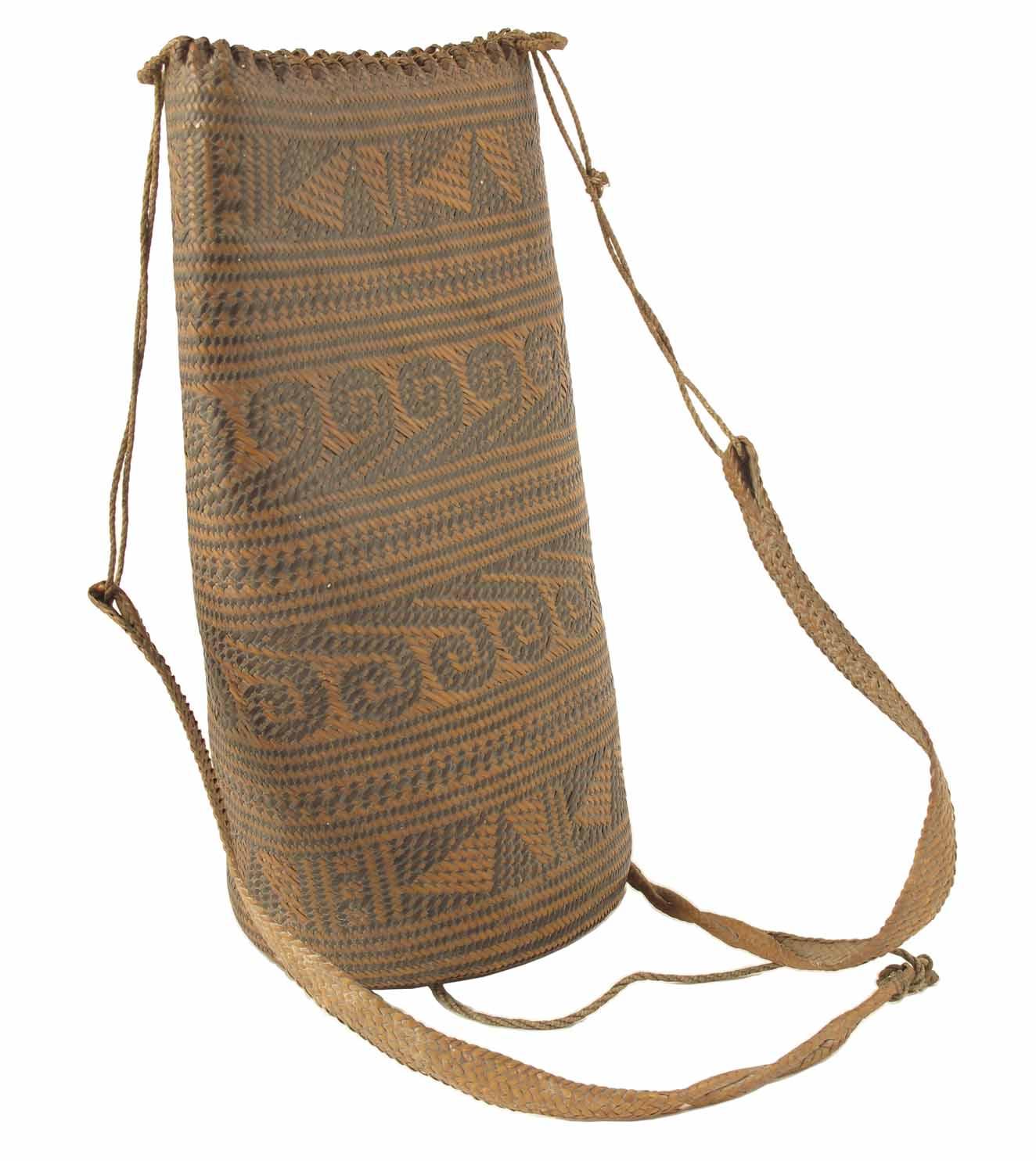 A fine Kelamantan basket, Borneo Indonesia, with woven bands of scrolls and geometric shapes with shoulder straps, late 19th/early 20th century, 14in (35.5cm) l, 7in (18cm) dia.