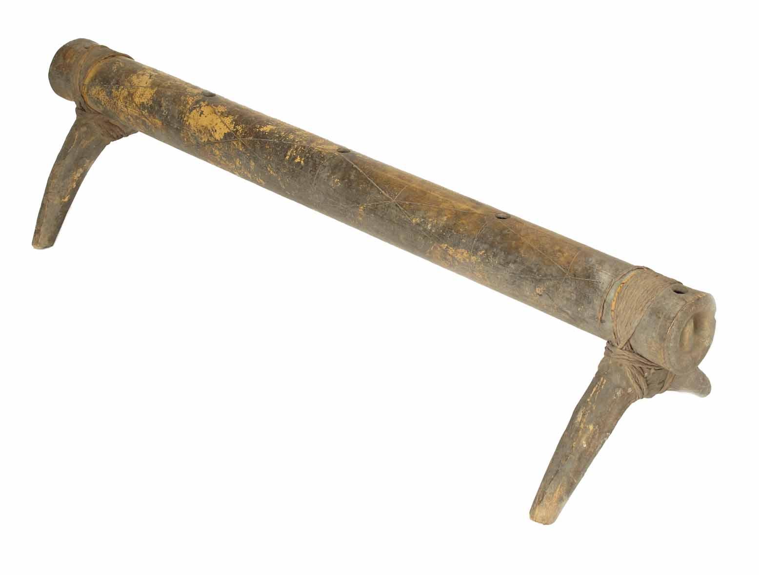 A rare Tongan headrest 'Kali Kofe', made from an old transverse bamboo nose flute 'Fangufangu' decorated with incised printing and pictorial designs with original plaited coir sinnet binding tied around the wooden legs, early 19th century, 26in (66cm) l.