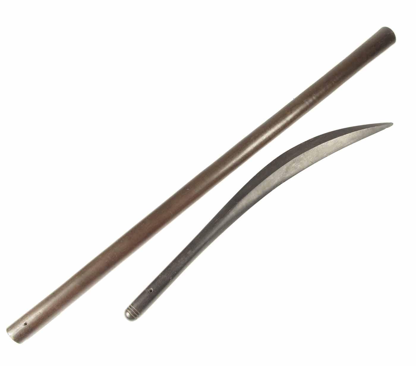 A 19th century Fijian pole club, 48.75in (124cm) l; together with a curved wood hand club, 32in (81.5cm) l. (2)