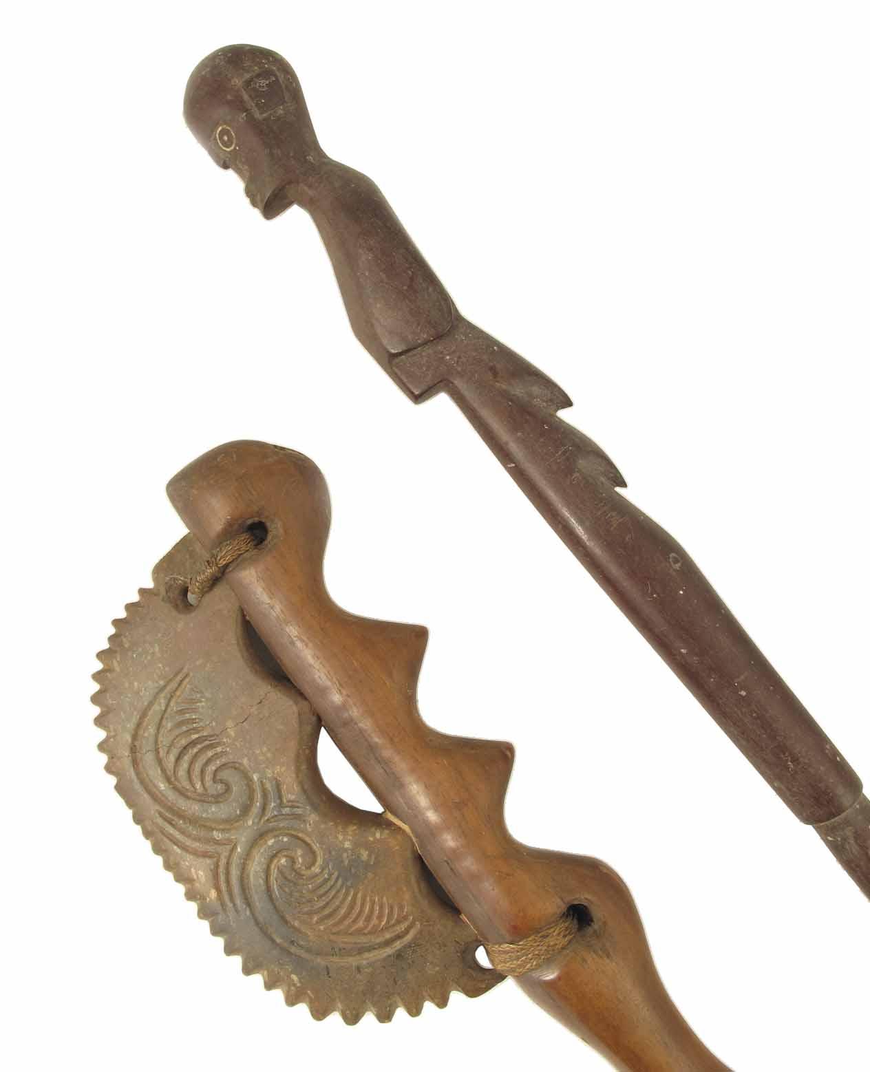 A 19th century Solomon Island wood figurative staff finial, 26in (66cm) l; together with a South Sea (Melanesia?) hand club with finely bound stone blade serrated edge, 19.25in (49cm) l. (2)