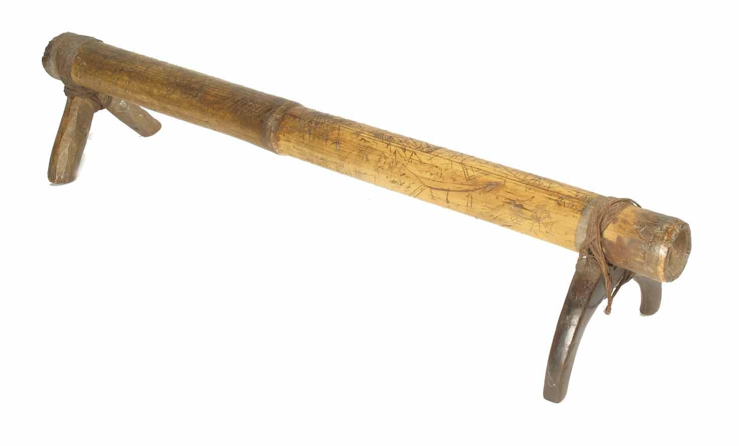 A rare Fijian bamboo and hardwood double headrest 'Kali Ni Butu', etched with pictorial designs with original sinnet binding and hardwood legs, early 19th century, with differing hardwood legs, 5.5in (14cm) h, 29.5in (75cm) l, 7in (18cm) d.