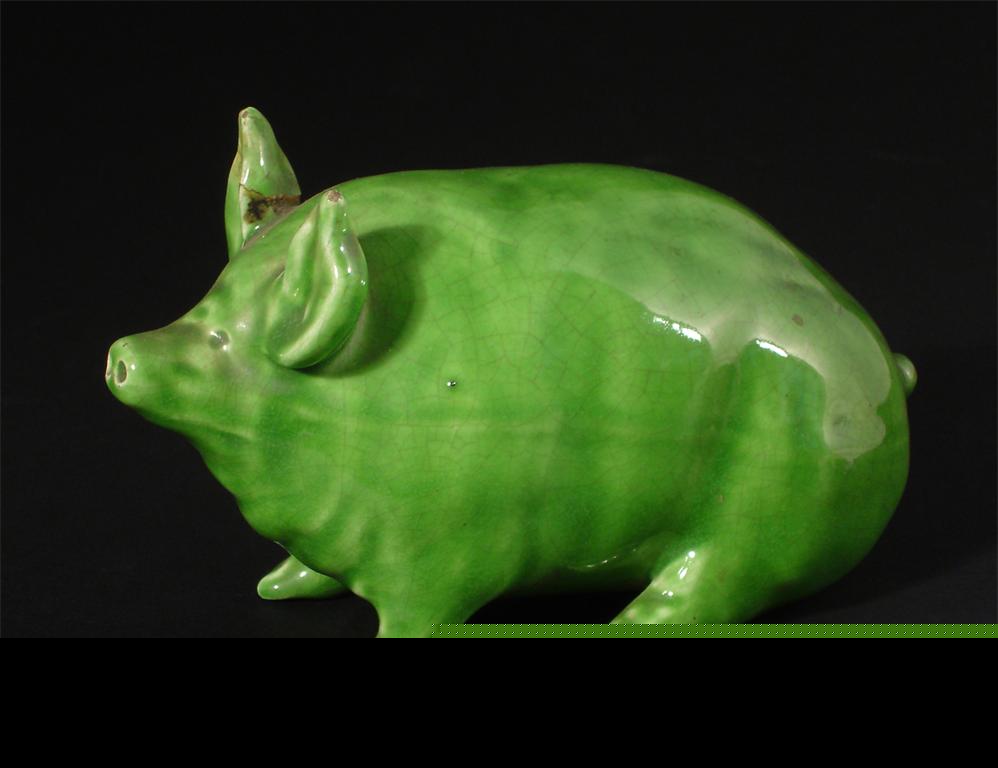 A Wemyss Pottery pig covered in a green glaze impressed Wemyss