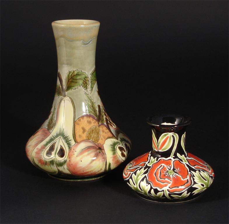 A Cobridge stoneware trial vase painted with fruit, and another limited edition vase impressed and painted marks 20cm. high