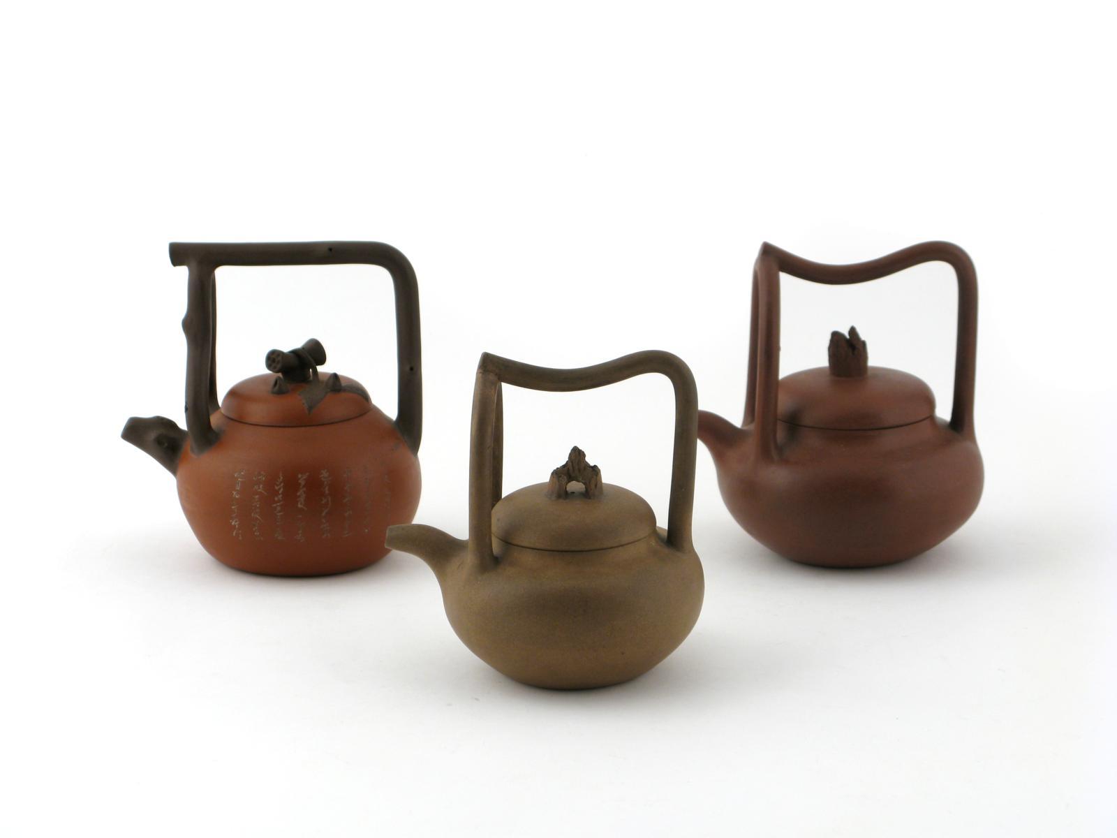 Three Yixing wine pots 19th / 20th century, the compressed globular bodies with tall vertical handles, one decorated with calligraphy, one with seal marks, minor faults, 15cm. (6) Provenance: the Arthur J Harris collection.