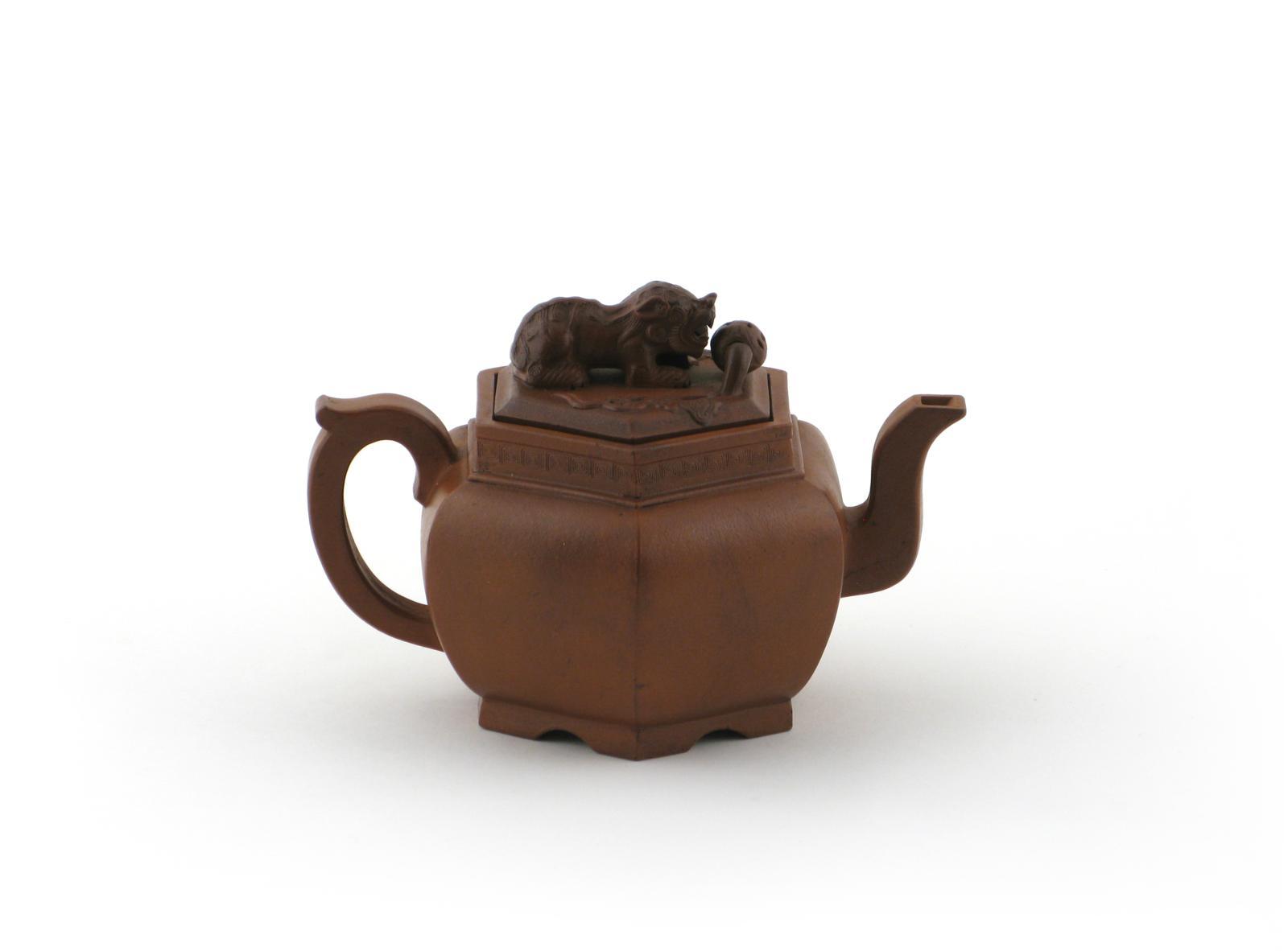 A hexagonal lobed Yixing teapot and cover mid 18th century, rising to a tall neckrim with a key fret band, on a shaped footrim, the cover finial formed as a lion dog biting into a spinning brocade ball, 16.5cm. (2)