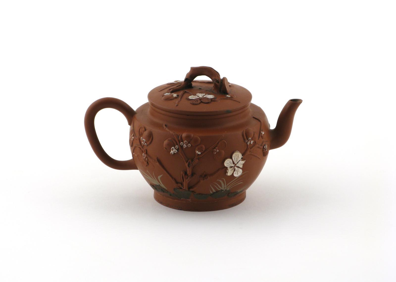 An unusual Yixing teapot and cover c.1700-25, the body applied and coloured with two small rabbits beneath a blossoming branch, the sun rising behind ruyi cloud scrolls, the reverse with further almond blossom, 16cm. (2)