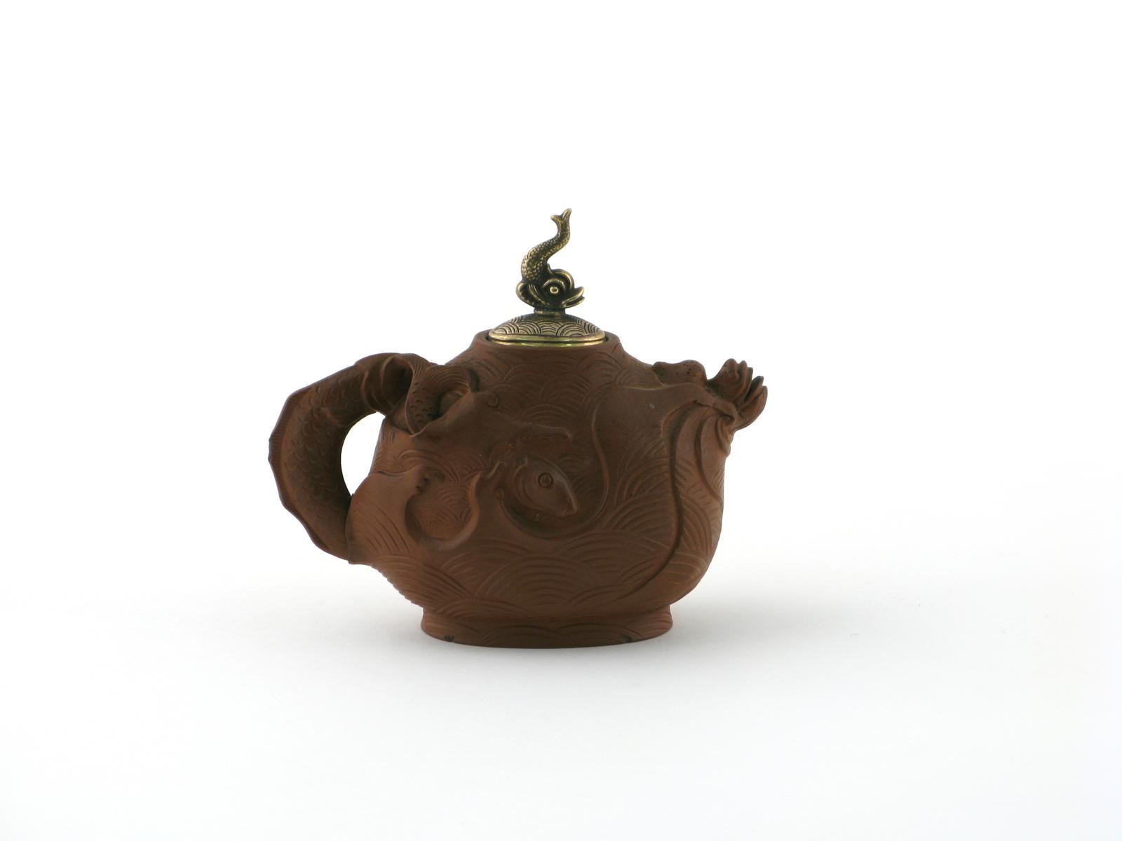 An unusual Yixing teapot and cover late 17th / early 18th century, formed as fish swimming amongst crashing waves, the spout formed as the head of a mythical beast, the handle as a large fish, the metal cover with a dolphin finial, some damage to the spout, 13.8cm. (2)