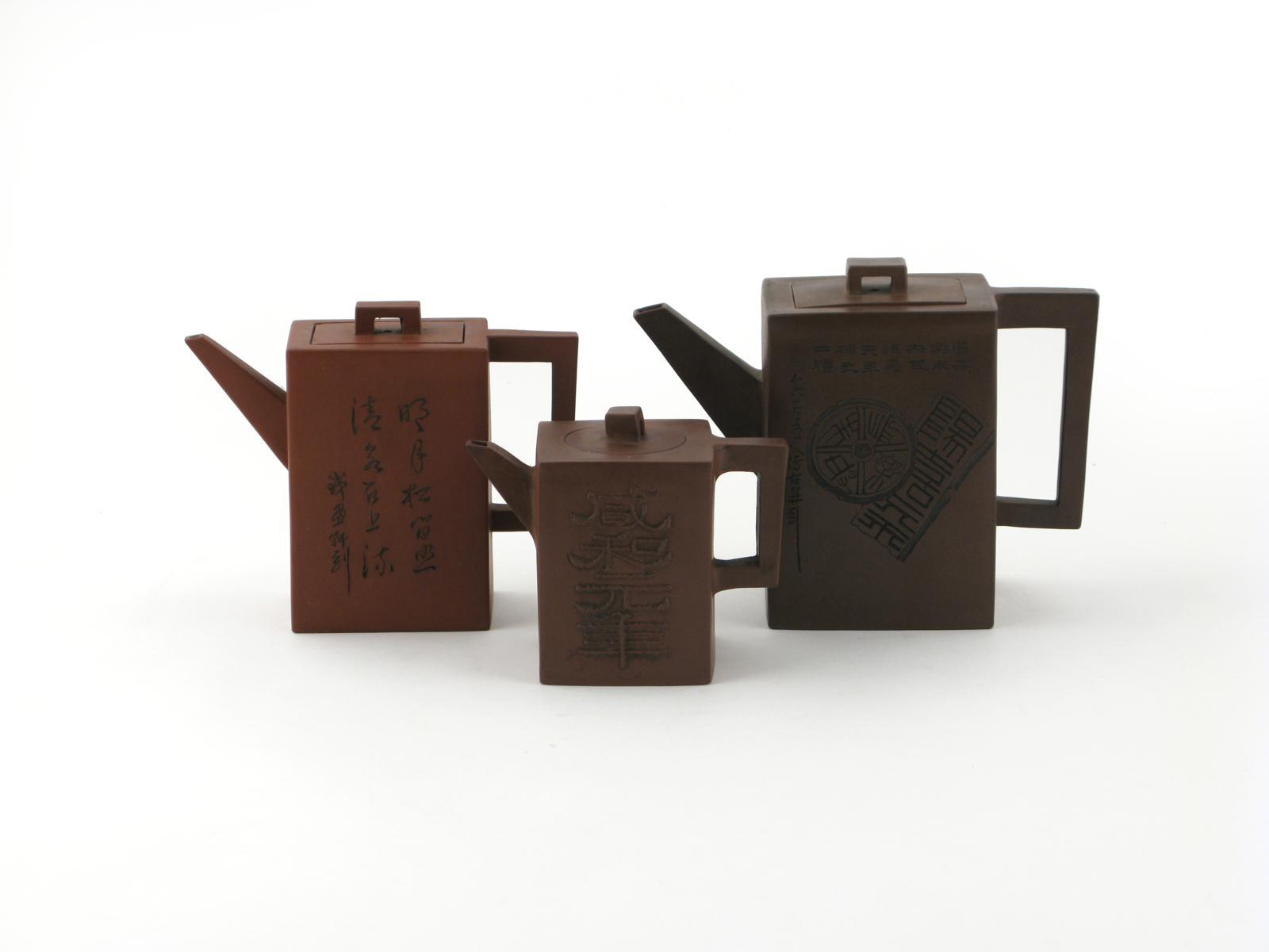 Three Yixing square section teapots and covers 18th / 19th century, variously decorated with a prunus branch, a figure in a landscape scene, calligraphy and Chinese characters, the two larger with seal marks, 23cm max. (6)