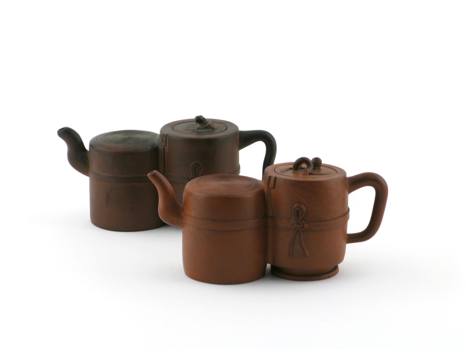 Two Yixing double teapots and covers 19th century, the bodies formed of two cylindrical barrels, the rear cylinder of each raised on a circular foot, 21.5cm. (4) Provenance: the Arthur J Harris collection.