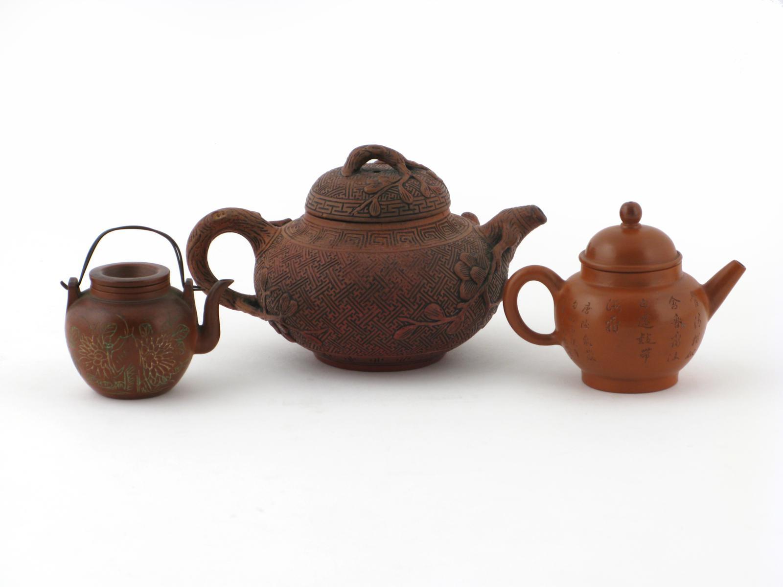 A lacquered Yixing teapot and cover 19th century, decorated with a key fret band above a herringbone design, and two miniature pots and covers, one with an inner liner, incised with calligraphy and chrysanthemum, 18.2cm max. (7)