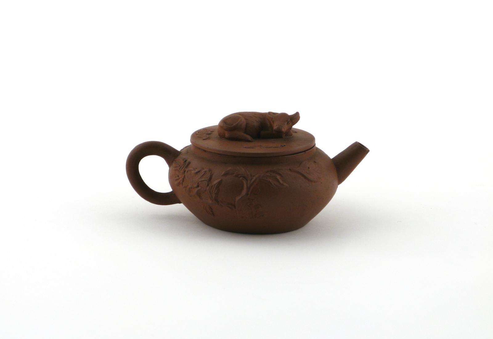 A small Yixing teapot and cover late 17th / early 18th century, the compressed globular body applied with chrysanthemum and peony sprays, the cover surmounted with a recumbent water buffalo, 13cm. (2)