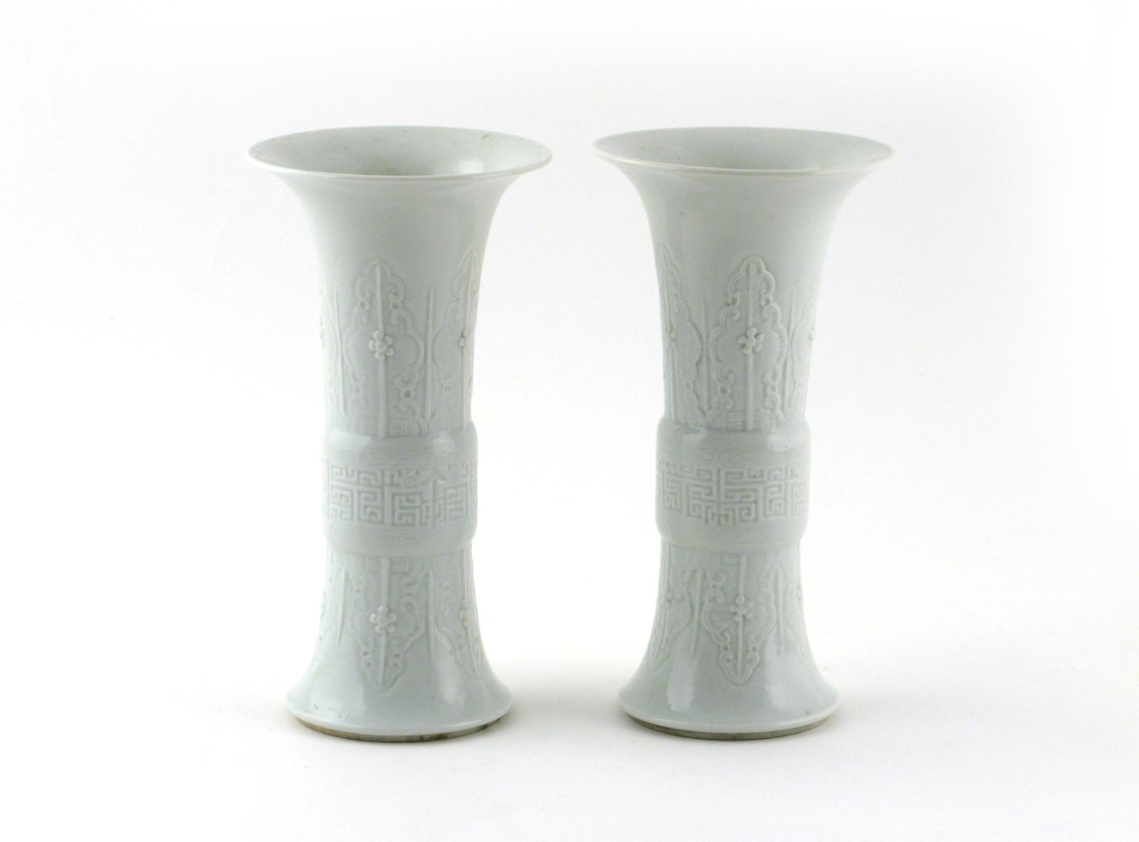 A pair of Chinese white glazed gu beaker vases 19th century, moulded with geometric bands and stylized stiff leaves, 24.4cm. (2)