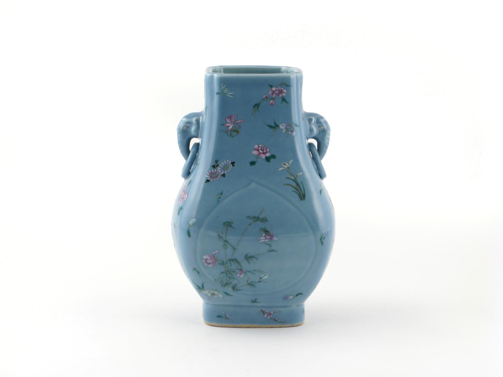 A Chinese hu-shaped vase six character Qianlong mark but later, the body moulded with peaches and painted with flowers and bamboo on a pale blue ground, 29.5cm.
