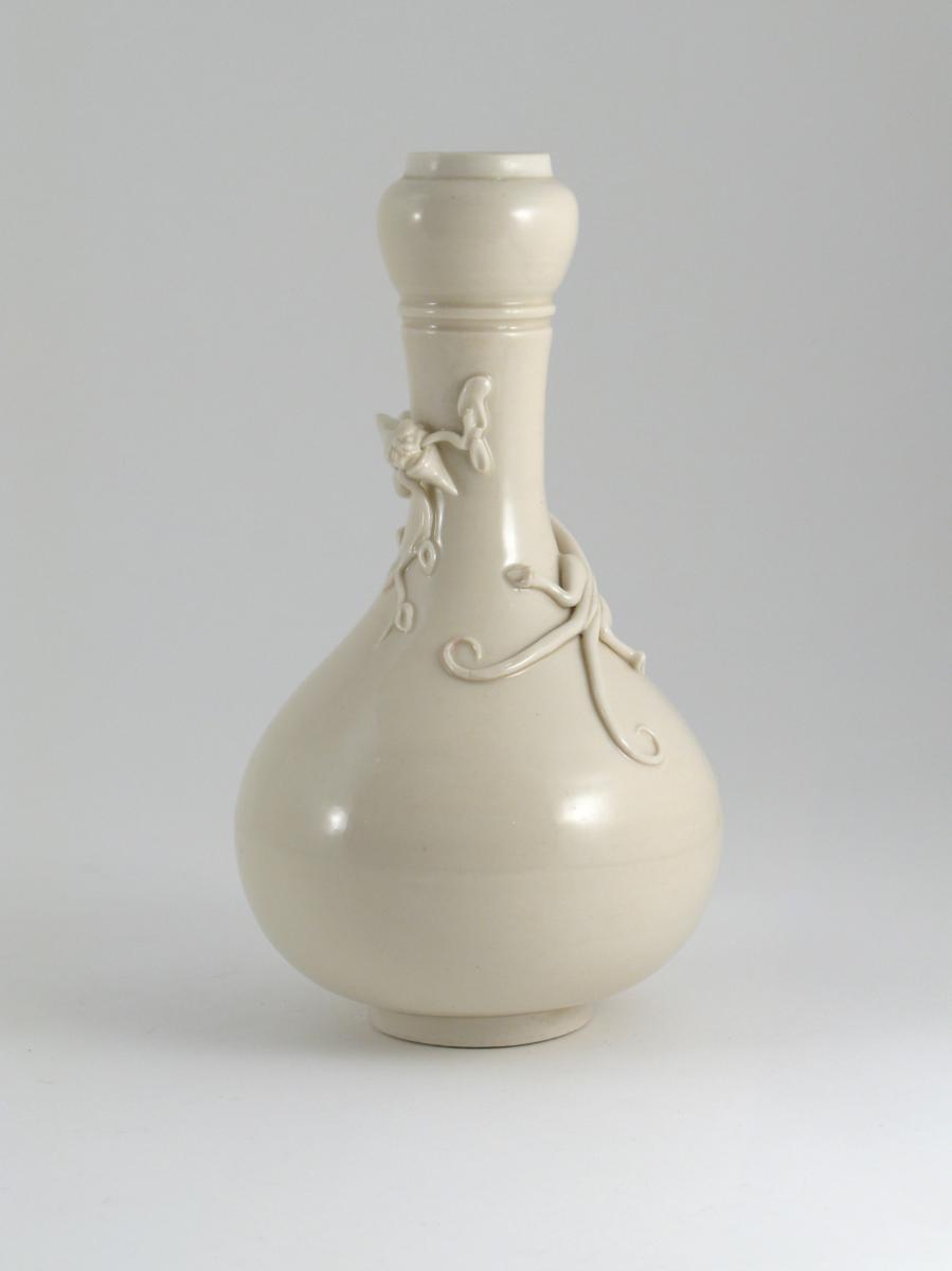 A Chinese blanc de Chine bottle vase of bronze form c.1640, with a ribbed slender neck with a garlic bulb below the mouth, entwined in high relief with a chilong dragon holding a leafy branch in its mouth, a little polishing to the mouth, 25.3cm.
