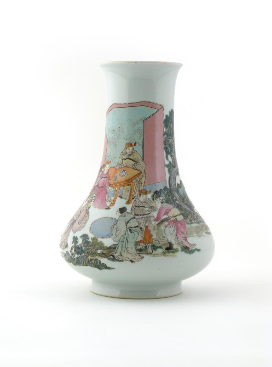 A Chinese famille rose vase c.1900, painted with eight figures at a table in various pursuits in the landscape, the base with a six character iron-red Qianlong mark, drilled, 27.5cm.