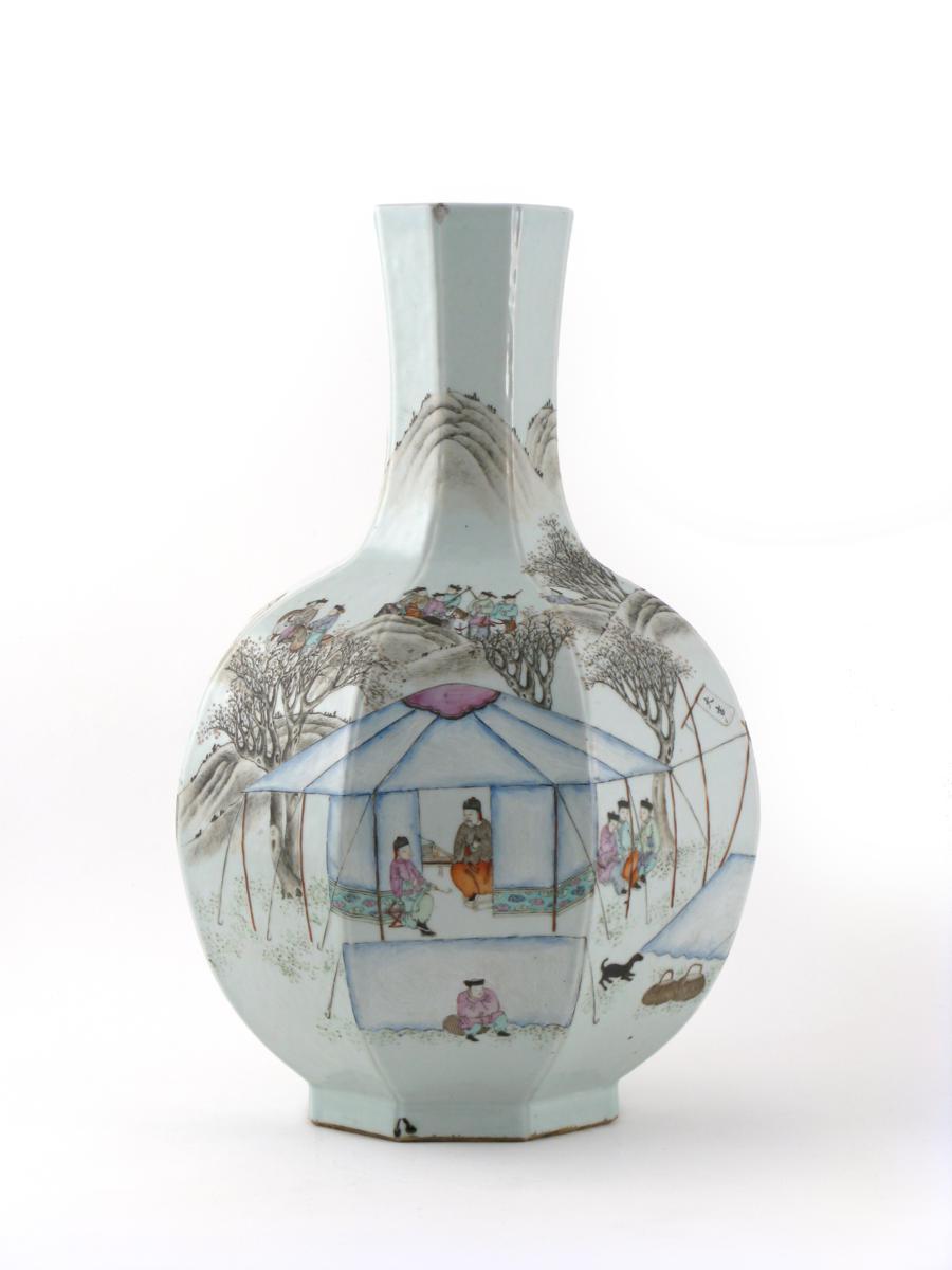 A large Chinese famille rose octagonal section bottle vase 19th century, painted with a scene of figures on a hunting expedition relaxing in tents, with horses and camels in a mountainous landscape, a small rim chip, 54.5cm.