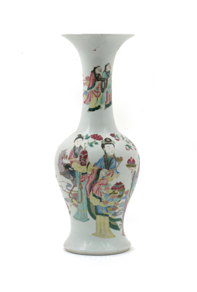 A Chinese famille rose vase 19th century, decorated with two maidens being presented with a dish of peaches, and with a phoenix, bats and further figures around the tall flared neck, unmarked, 45.8cm.