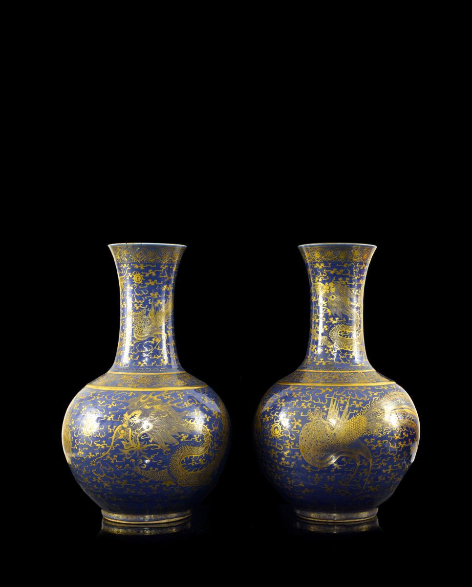 A massive pair of Chinese bottle vases Guangxu 1875-1908, each richly decorated in gilt with a dragon and phoenix contesting flaming pearls on a ground of cloud scrolls, the flared necks with similar designs between borders of ruyi, shou and auspicious symbols all on a blue ground, the bases with sic character Kangxi marks in a rectangule between confronting enamelled dragons, one with damage to the neck, 59cm. (2)