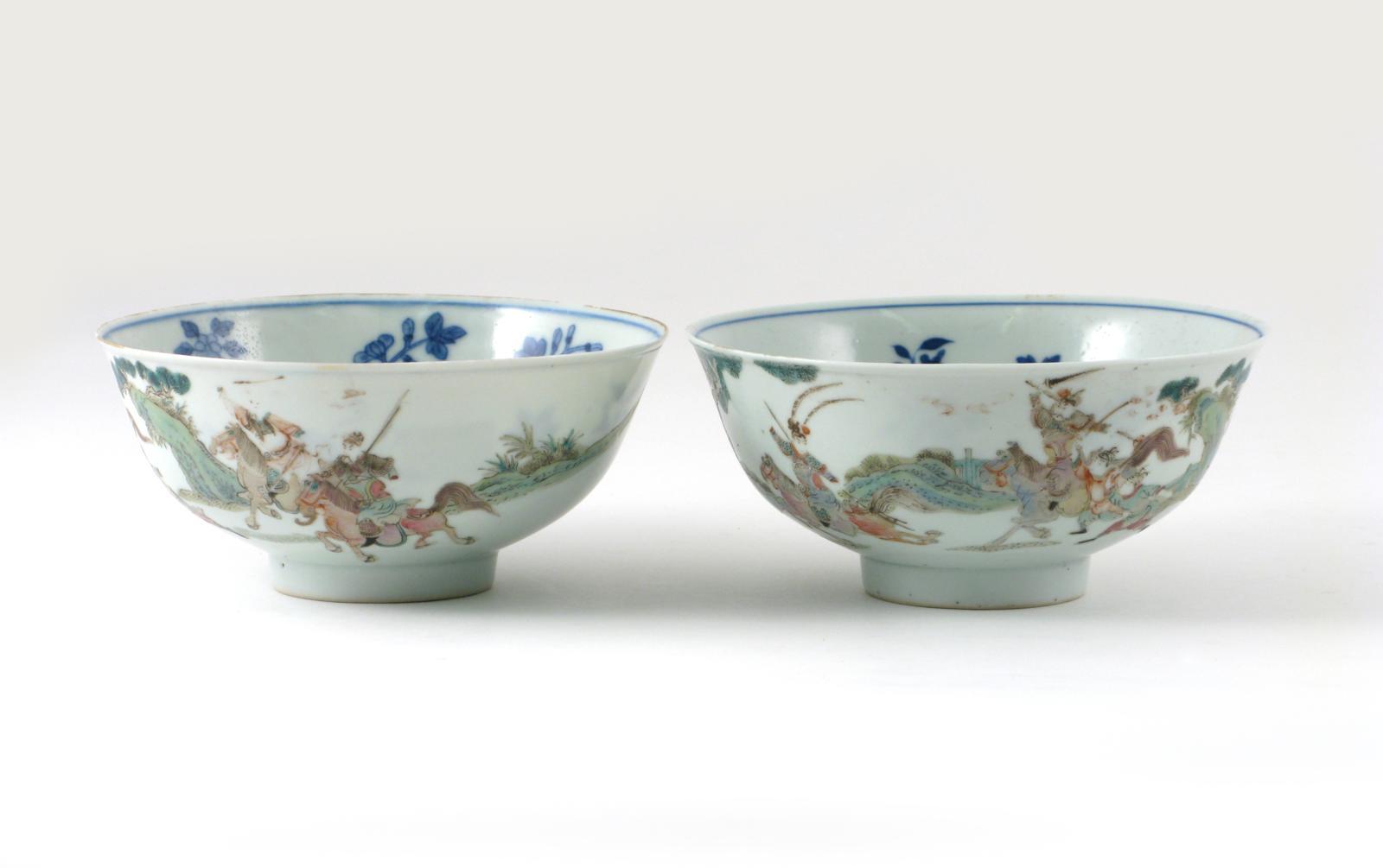 A pair of Chinese famille rose bowls six character Qianlong seal marks but later, the interiors painted in blue with flowers, fruit and fungi, the exteriors with warriors on horse back, one with a clean rim crack, 14.5cm. (2)