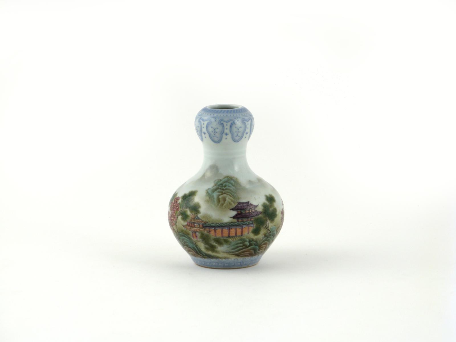 A small Chinese famille rose vase four character Qianlong mark but later, painted with a pagoda landscape and with figures in a small boat, the reverse with calligraphy, 11.7cm.