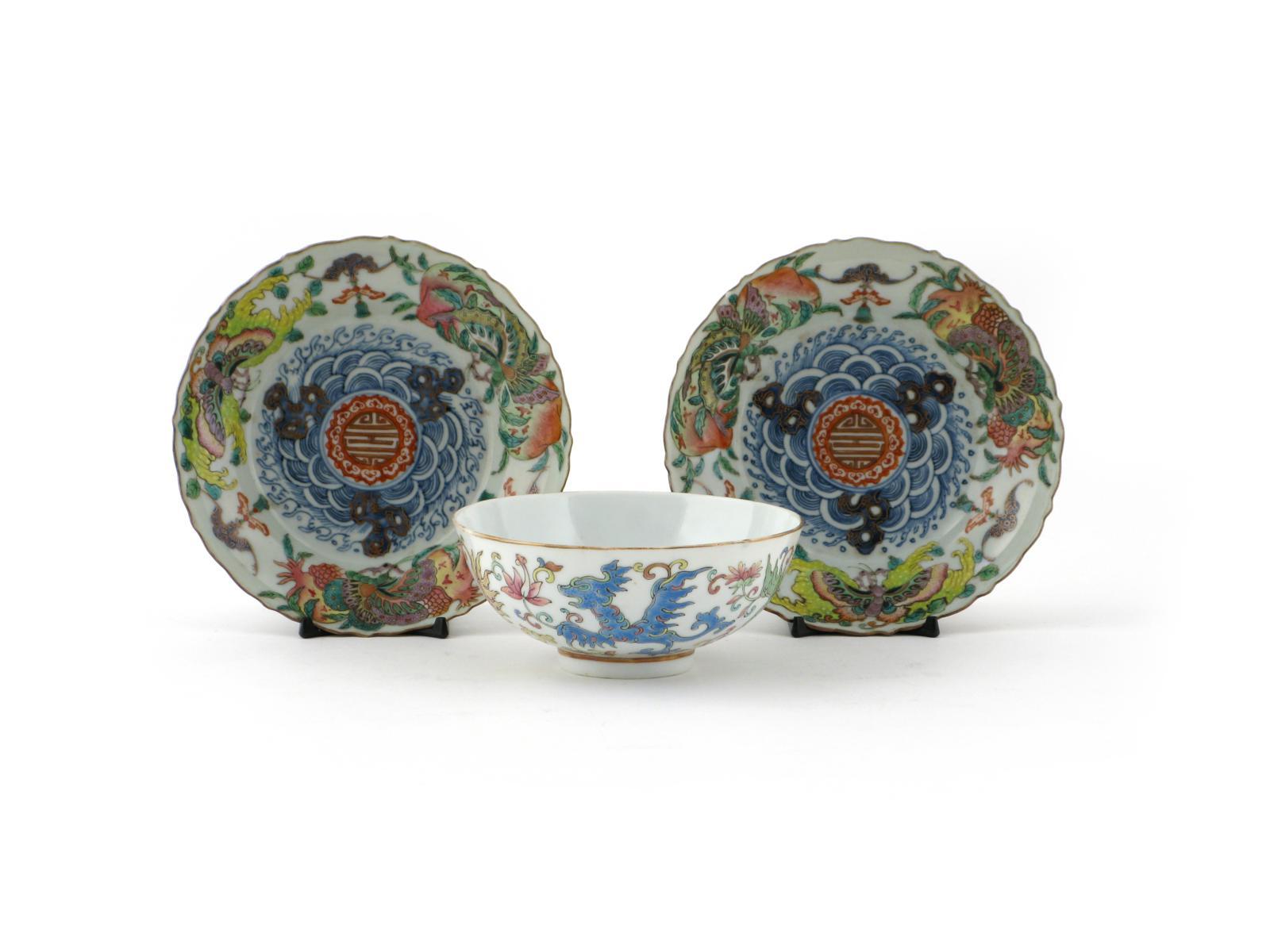 A pair of Chinese porcelain fengcai and underglaze blue saucers Jiaqing seal marks and perhaps of the period, decorated with pomegranates, citron and peaches around a central shou character, and a fengcai small bowl enamelled with dragons, Tongzhi seal mark, 13.2cm max. (3)