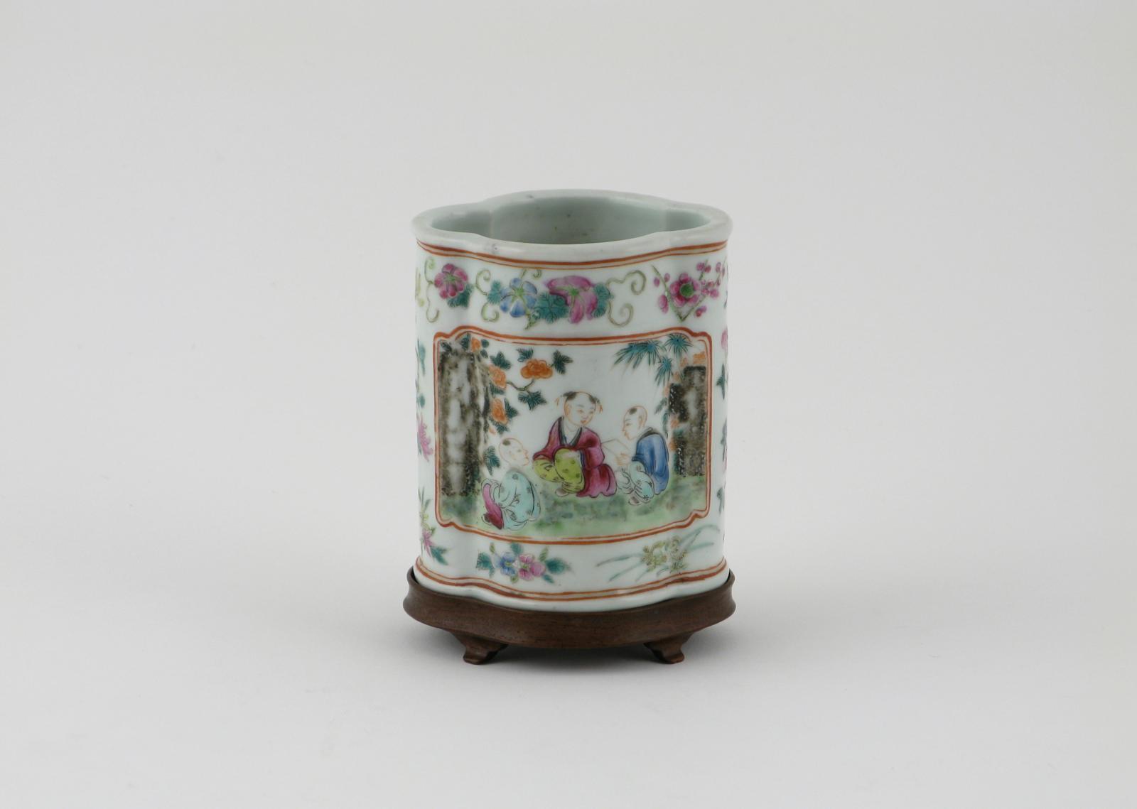A Chinese famille rose brush pot c.1900, the quatre-lobed body painted with two panels of children, the base with a six character iron-red mark, together with a hardwood stand, 10cm. (2)