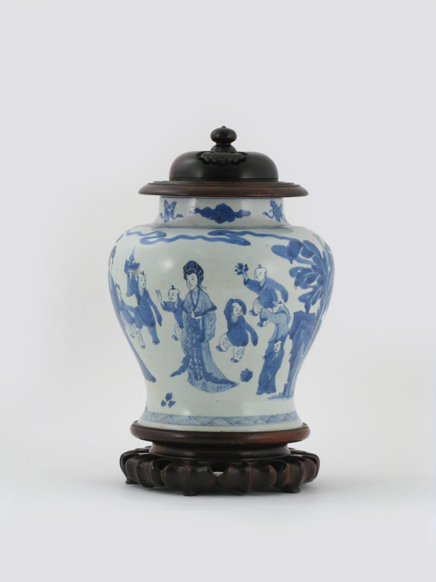 A Chinese blue and white vase Kangxi 1662-1722, the baluster shaped body decorated with four young women attending small boys in a rocky landscape, a later wood cover and stand, 3cm crack, 22.5cm. (3)