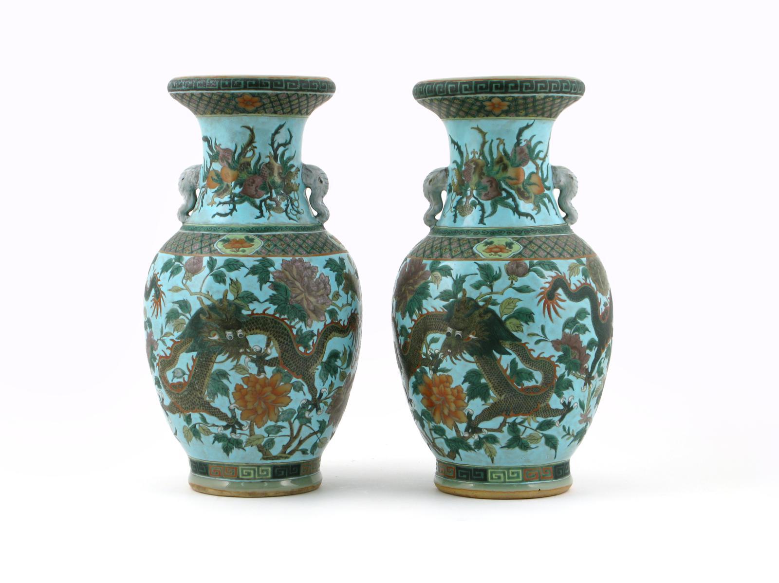 A pair of Chinese turquoise ground vases 20th century, painted with dragons, flowers and fruit, each with a six character Qianlong mark, 40.5cm. (2)