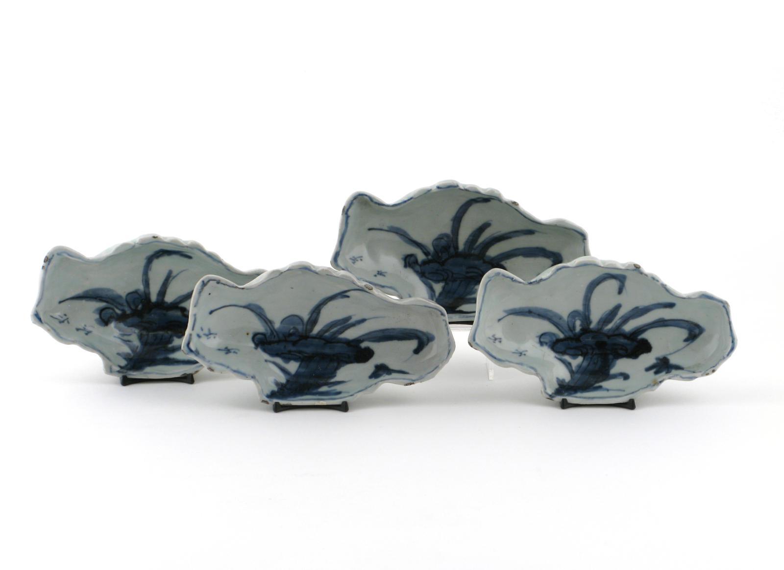 A set of four Chinese blue and white dishes 17th century, made for the Japanese market, of irregular moulded form, raised on three stump feet and loosely painted with lingzhi fungus, small rim chips, 17.8cm. (4)