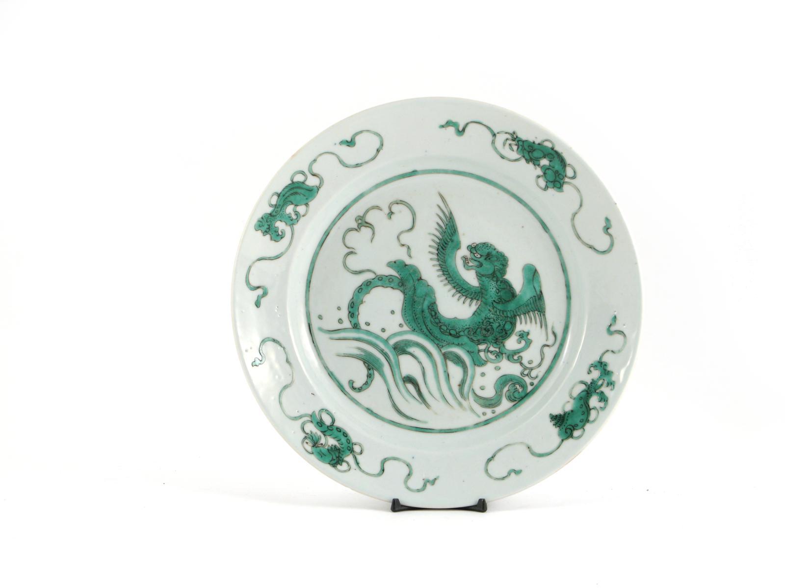A Chinese green enamelled dish 18th century, painted with a winged sea dragon, and with conch shells and sea creatures to the border, 21.2cm.